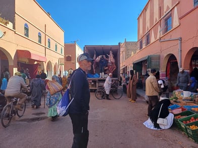 Rissani ist überraschend groß und lebendig, es ist Markt und die ganze Stadt brummt vor Geschäftigkeit. Wir kaufen Bustickets, stellen unsere Räder am CTM-Büro unter und schlendern shoppend und Kaffee trinkend durch das Gewusel. Am Ende landen wir dann bei einem deutschsprachigen Händler, der uns mit Tee bewirtet und mit uns über Gott, die Welt im Allgemeinen und Marokko im Besonderen philosophiert. Inzwischen ist es ziemlich kalt geworden und wir sind froh, als wir endlich in den Bus einsteigen können. Die Fahrt ist so unbequem, wie fahren im Nachtbus eben ist. Wir sind mit Decken und Ohrstöpseln bewaffnet und ertragen daher laute Telefonate, wummernde Klimaanlage und andere Zumutungen mit Fassung.