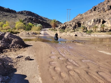 Unser Fahrer lässt Luft ab um durch das Flußbett zu fahren