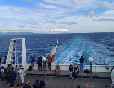 Also wuchte ich die Räder einzeln hochkant in den winzigen Aufzug. Unten warten wir - eh klar! - vergeblich auf den Polizisten. Als wir schließlich ohne Begleitschutz versuchen, zu unserem Schiff zu gelangen, treffen wir bald auf eine Horde ziviler Polizisten, Modell schmierige Mafiosi, deren einziges Lösungsangebot darin besteht, zu sagen „Io sono policia, non puoi passare qui!“