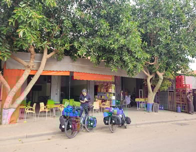 Erst nach gut 50km wird der Verkehr weniger, dafür aber auch die Straße schlechter und der Wind dreht uns entgegen. Dennoch macht das Fahren hier deutlich mehr Spaß. Es ist sommerlich warm, ohne den Wind wäre es heiß. Irgendwann brauchen wir eine kleine Pause und kehren in einem Gärtchen an der Straße ein, wo man uns zwei sehr leckere Minztees für unglaubliche 8 Dirham serviert, etwa 75 Cent.