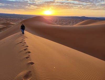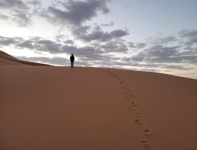 (C) Wir stehen noch in der Dunkelheit auf, es ist 7 Uhr morgens. Wir wollen mit dem Sonnenaufgang in den Dünen sein, am besten auf der allerhöchsten, um einen möglichst guten Blick zu haben. Draußen ist es sehr dunkel und sehr kalt. Es ist gar nicht leicht, sich zu orientieren, die Steilheit selbst bei kleinsten Dünen ist im Dunkeln schwer abzuschätzen und so stolpern wir anfangs mehr durch den Sand als wir gehen. Allmählich geht es besser, wir suchen in der beginnenden Dämmerung den besten Weg und kommen gut voran, obwohl es zunehmend steiler wird. Wir müssen ganz schön kämpfen und schnaufen, insgesamt geht es gute 200MH rauf, bevor wir endlich auf der höchsten Düne sind und eine tollen Rundumblick genießen können. Leider ist es leicht bewölkt und der Sonnenaufgang ist unspektakulärer als erwartet, aber wir sind trotzdem happy. In den Dünen rundum, aber viel weiter unten, sind noch einige andere Frühaufsteher; die meisten sind aber ganz faul mit dem Jeep angereist.