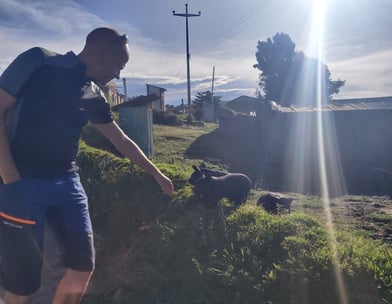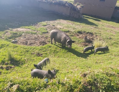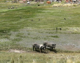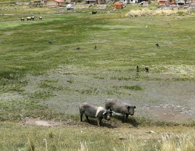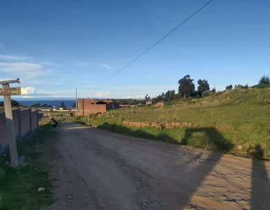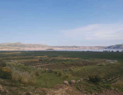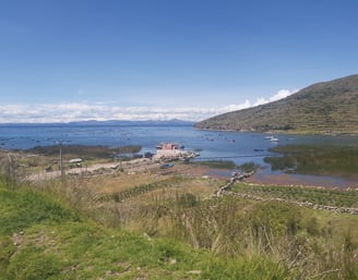 Wir radeln in den ersten Ort, holen uns mehr Soles am Bankautomaten, und weiter geht es entlang des Sees. Die ersten 10km sind fad, stangelgeradeaus, eben und von tristen Gebäuden flankiert. Aber dann wird es wieder schöner, ländlicher. Nach einem Umweg ins Landesinnere folgt die Straße jetzt der Wasserlinie. Wir sehen grüne Äcker und Weiden voller Schafe, Kühe und Schweine auf der einen Seite, den See mit Forellenzuchten auf der anderen. Mittags essen wir an der Straße, anschließend kommt ein längerer Anstieg auf einen Höhenzug. Auf diesem zweigt der Weg ab zu unserer Unterkunft, einem gemütlichen Zimmer bei einem sehr freundlichen Peruaner. Wir gehen mit den letzten warmen Sonnenstrahlen durch den kleinen Ort spazieren bis zum See, und ruhen dann, bis wir vom Wirt zum Abendessen gerufen werden.