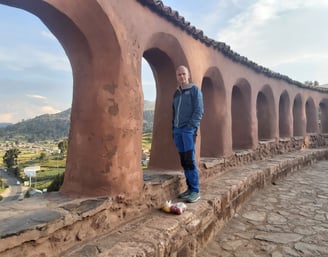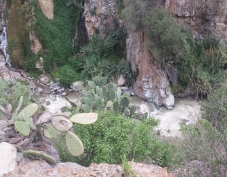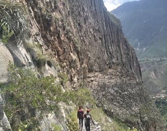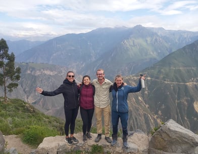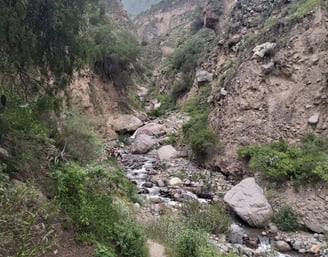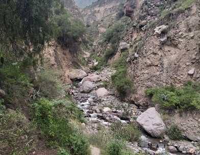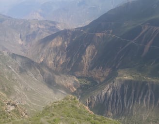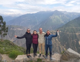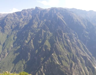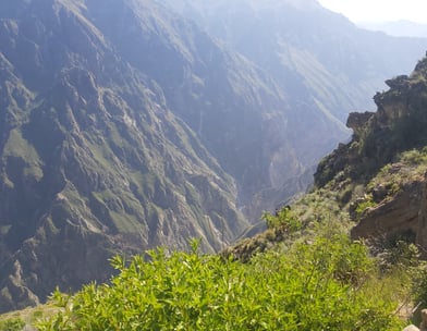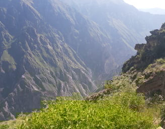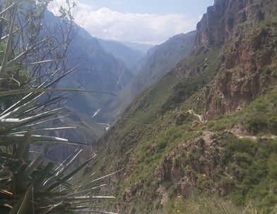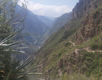 Als alles Wichtige und Nichtige erledigt ist, bleiben uns noch 2 Tage übrig, weshalb ich finde, dass ein Ausflug ins Umland angezeigt wäre. Ich will den berühmten Colca-Canyon besichtigen, der quasi zum Pflichtprogramm aller Rucksackreisenden hier gehört. Daniel streikt, er hat genug gesehen. Um nicht alleine wandern zu müssen, schließe ich mich einer geführten Tour an, die 1,5 Tage dauert. Es geht schon um 3 Uhr morgens los, die Anfahrt nach Chivay zum Canyon ist 140km lang und dauert mehr als 3 Stunden. Daniel ist bei meiner Abfahrt wieder magenkrank; das hat er davon, dass er mich im Stich lässt! Die Tour umfasst neben einer Wanderung in einer 4er-Gruppe auch allerlei touristische Highlights wie den Besuch diverser Aussichtspunkte, Märkte und das Bad in einem Outdoorthermalbad. Das Trekking selber ist wunderbar und sehr anstrengend. Der Canyon ist durchaus sehenswert, wir steigen mehr als 1.000m ab, um unten über wundervolle Terrassenfelder dem Fluss entlang zu wandern bis zu einer Oase, in der alle geführten Gruppen übernachten. Meine Reisegruppe besteht neben dem peruanischen Führer namens Hans (kein Witz!) noch aus einer deutschen Lehrerin, einer französischen Physiotherapeutin und einem holländischen Ingenieur. Wir verstehen uns sehr gut und haben viel Spaß miteinander. Wir teilen Mahlzeiten und Wanderschmerzen, pflücken reife Feigen am Wegesrand und plantschen abends gemeinsam im Pool unserer Unterkunft. Der Aufstieg zum Bus am nächsten Morgen beginnt schon um 4 Uhr im Stockfinsterem und dauert fast drei Stunden.