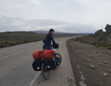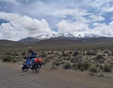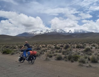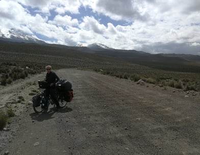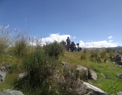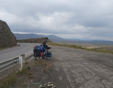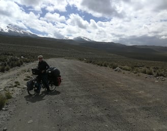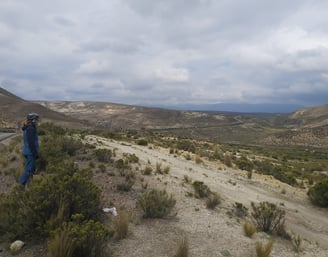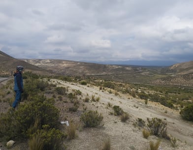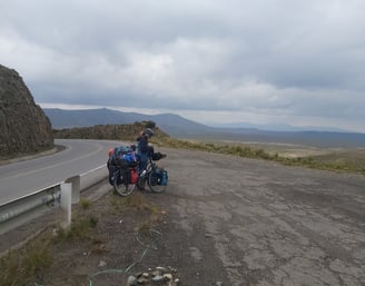 In der Früh sind wir um 6 Uhr wach. Der Himmel ist bleigrau und es bläst ein kräftiger Wind – in unsere Richtung! Da es hier auch kein Frühstück gibt, kochen wir uns einen Tee im Zimmer und radeln los. Gelobt sei der Sturmkocher, der auch indoor funktioniert! Zunächst gibt es keinen Verkehr, und die Strecke ist fast eben. So fliegen wir dahin. Früher als erwartet kommen aber die LKWs aus den Löchern, ganze Verbände strömen aus irgendwelchen Minen. Zum Glück hat die Straße einen durchgehend guten Randstreifen, auf dem wir ungestört fahren können. Nach und nach wird die Straße welliger, und sofort ist die Höhe von 4.400m spürbar; wir haben Mühe und Atemnot mit jedem kleinen Anstieg.