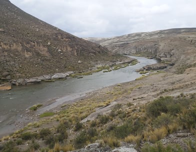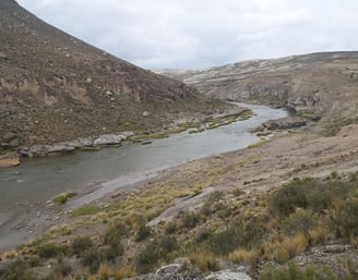 Nach zwei Stunden Fahrt, kurz nach 9 Uhr, erreichen wir das Ende der Hochebene, und es geht für 15km hinunter in ein Tal bis auf 3.925m. Da die Straße weiterhin gut und übersichtlich ist, stelle ich einen persönlichen Geschwindigkeitsrekord mit voll beladenem Rad von 73,8km/h auf. Kaum unten, geht es im Gegenanstieg ziemlich sanft bis zu einer großen Kreuzung. Hier zweigt nun die ruta vieja (alte Straße) nach Arequipa ab. Zuvor aber gönnen wir uns eine Stunde Pause und ein richtig dickes Mittagessen aus einem Hamburger und einem großen Kotelett mit Reis, Kartoffeln und Salat für jede, einem Liter Saft und zwei großen Tees. Währenddessen regnet es für eine halbe Stunde.