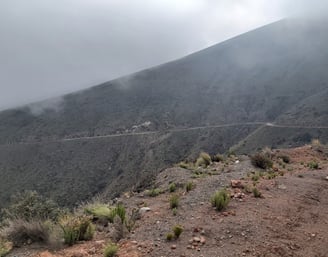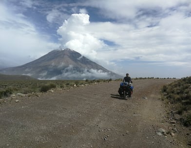 So gestärkt, beginnen wir den Abenteuerteil der letzten Etappe in Südamerika. Der Einstieg ist gleich mal ein Schock: Es geht stark bergauf, und die Strecke ist eine Mischung aus Sand, Steinen und Waschbrettwellen. Ich schinde mich im ersten Gang hinauf, während Conni gleich schiebt. Natürlich setzt jetzt auch ein leichter Regen ein, der aber nach wenigen Minuten wieder einschläft. Da wir schon fast die Hälfte der Kilometer und der Höhenmeter geschafft haben, könnten wir bald unser Zelt aufstellen. Aber es ist immer noch früh, kurz vor 12 Uhr, das Wetter hält noch, und der Wind bläst weiter in unsere Richtung. Also kriechen wir weiter vorwärts über die unfassbar miese Piste durch wirklich wunderschöne Landschaft. Auf der einen Seite eine schneebedeckte Bergkette, auf der anderen der (nomen est omen) in Nebel gehüllte Misti, der 5.822m hohe Hausvulkan von Arequipa. Als wir ihn fast erreicht haben, machen die Wolken auf, und wir können den Berg in seiner ganzen klassischen Schönheit bewundern!