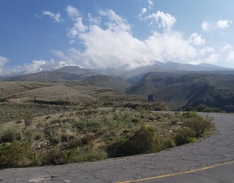Die alte Straße ist schwer zu fahren, aber wunderschön! Blick auf den Vulkan Misti und andere schneebedeckte Berge