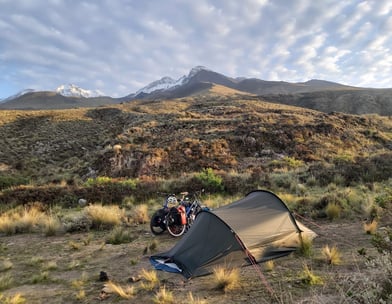 Gegen halb fünf, nach über 9 Stunden auf der Straße, kommen wir an einem kleinen Plateau vorbei, auf dem sich gut ein Zelt aufstellen lässt. Wir haben von hier eine herrliche Sicht auf Arequipa, tief unten im Tal, sehen den Beginn der Teerstraße, und es ist jetzt ganz klar, dass wir erst bei völliger Dunkelheit in die Stadt kämen und dort noch lange Zeit durch die Vororte fahren müssten. Also bauen wir ein letztes Mal in Südamerika unser Zelt auf, genießen die absolute Stille und den 360°-Rundblick auf Stadt und Schneeberge, essen jede ein kleines Brot mit einer Banane, und legen uns mit Sonnenuntergang erschöpft ins Zelt.