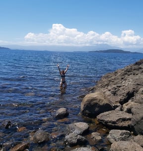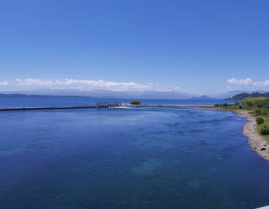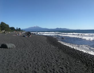 Mittags machen wir eine lange Pause am Strand, bei dem Conni mehrmals baden gehen muss, um Abschied vom letzten der chilenischen Seen zu nehmen, die uns die letzten knapp zwei Wochen so sehr gefallen haben.