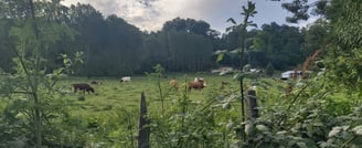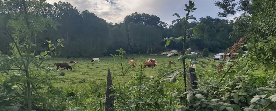 Nach dem See geht es eine lange Weile mittelsteil bergauf. Wir sind aber schon so sehr trainiert, dass es uns erfreulich wenig ausmacht. Die anschließende kilometerlange Abfahrt können wir so richtig genießen, wenn nicht plötzlich wieder starker Wind aufkäme. So strampeln wir halt mit 22 km/h bergab. Auch ok. Die Weiden neben der Straße sind voller Rindviecher. Eine riesige Herden Kälber galloppiert neugierig zum Zaun, als sie uns im Vorbeiradeln erspäht. Schaut extrem witzig aus!