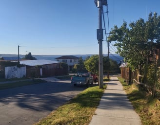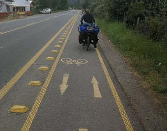Wir treffen einen jungen Mann, der sein Rennrad die Straße entlang trägt. Er macht eine pumpende Bewegung, ich nicke, und er kommt begeistert zu uns rüber. Er hatte einen Platten und die schicke Gaspatrone, die er statt einer Pumpe dabei hatte, hat wohl nicht funktioniert. Unsere Standpumpe begeistert ihn, wir unterhalten uns, und er ist verblüfft, dass wir nach Puerto Montt durchfahren wollen, statt im viel schöneren Puerto Varas zu übernachten. Das ist zwar etwa 3km abseits unserer Strecke; aber im Weiterfahren setzt sich der Gedanke durch, dass es mit diesem Wind einfach keinen Spaß macht, die 20km nach Süden bis Puerto Montt heute noch zu fahren. Wir ändern den Plan.
