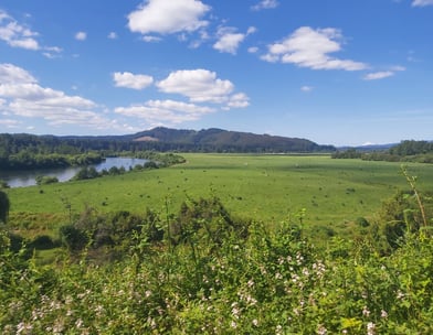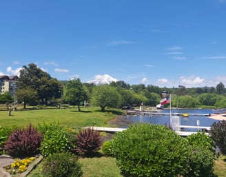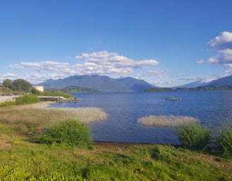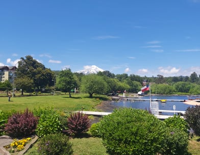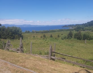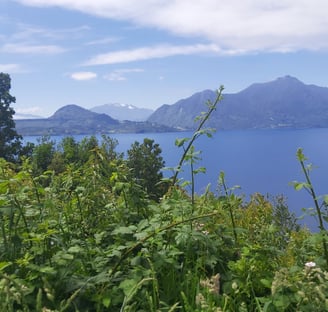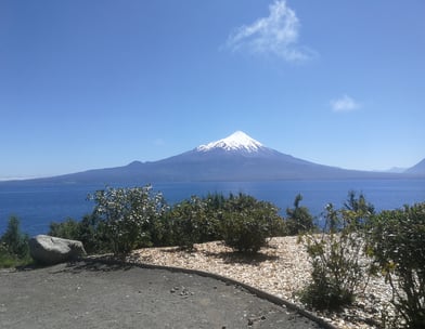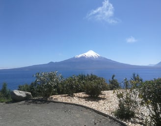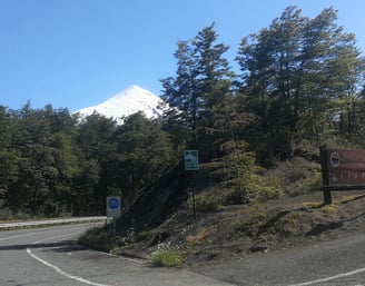 Die Landschaft gibt heute erst mal wieder ihr bestes um uns zu gefallen. Saftig-grüne Wiesen, Berge, in der Ferne gleich mehrere Vulkane, von denen der Osorno immer der dominanteste bleibt. Es ist nicht weit zum nächsten schönen See und wir machen nach ca. einer Stunde die erste Rast um die Aussicht zu genießen. Ein anderes Paar hat dasselbe beschlossen. Der Mann hat Allergie und niest kräftig. „Gesundheit!“ rutscht es mir raus. Er guckt verblüfft, grinst dann und sagt mit spanischem Akzent „dankeschon!“ Jetzt staune ich! Hier im Süden leben viele Deutschstämmige und ab jetzt versucht eigentlich stündlich jemand uns mit deutschen Wortbrocken zu erfreuen.