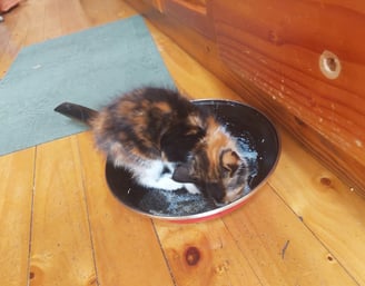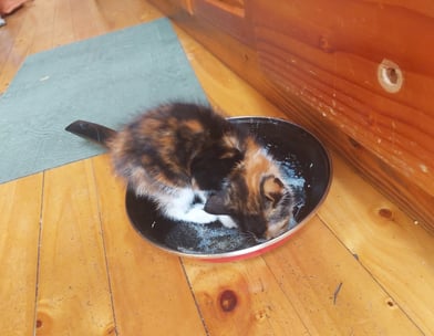 Unsere Vermieterin hat neben haufenweisen niedlichen Enkeln auch eine oberniedliche Babyglückskatze, die öfter mal bettelnd und maunzend in unser Appartement schleicht. Nicht ganz ohne Erfolg. Nach erfolgreichem Beutezug rollt sie sich dann auf unseren Jacken zusammen und pennt stundenlang.
