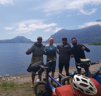 Tatsächlich folgen 15 entspannte Kilometer auf einsamer Landstraße mit Radweg, gegen den obligatorischen Wind; aber das braucht der Körper inzwischen ja schon fast. Als wir wieder auf den See treffen, machen wir an einem Aussichtspunkt Pause. Hier treffen wir das erste Mal auf andere Reiseradler! Die drei Chilenen, die auch in unsere Richtung radeln, scheinen aber das Konzept des absoluten Minimalismus zu verfolgen, mit kaum Gepäck und Schlafen am Strand. Sie bewundern unsere Räder, wir bewundern ihre Leidensbereitschaft. Wir tauschen uns eine Weile mit Christian, Sebastian und Francisco aus. Nach einer Session mit Gruppenbildern brechen wir dann wieder auf. Und dann wir es so richtig fies.