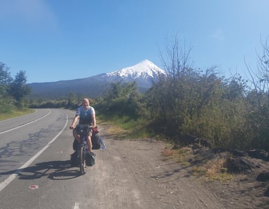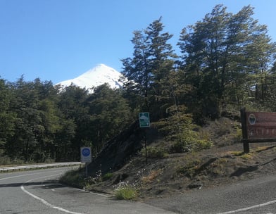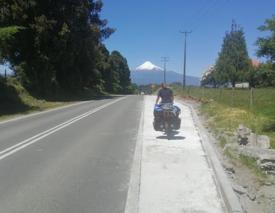 Nach 40km gibt es einen Tee. Von hier an soll die Strecke für 22km geschottert sein. Aber nach nur 650m kommt wieder frischer Asphalt für 14km, und auch die sich anschließenden 7km Schotter gehen vorbei. Und auf der Zielgeraden nach Entre Lagos tauchen dann zwei Vulkane zwischen den Bäumen auf, einer davon der Osorno, auf den wir noch zwei Tage zufahren werden, und als wir am See ankommen, ist der Horizont voller schneebedeckter Berge.