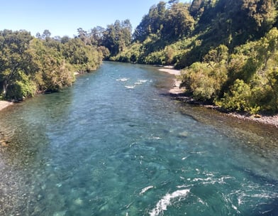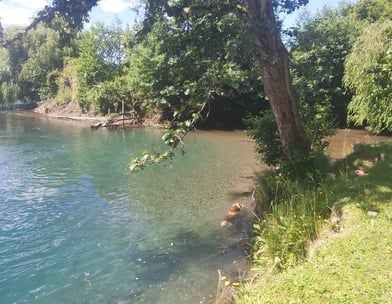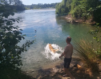 Wir fahren nicht bis Los Lagos, von dem wir uns wenig versprechen. Stattdessen nehmen wir uns kurz vorher eine wunderschöne Cabana mit tollem Blick auf und einem Zugang zum Fluss. Conni badet, ich gehe nur bis zu den Knien hinein und werfe stattdessen dem örtlichen Retriever, der uns freudig ans Wasser begleitet hat, immer wieder Holzstücke in den Fluss, die er mit größter Begeisterung holt.