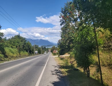 Erst nach den ersten 20 km wird es besser; die ersten Sonnenstrahlen kommen raus und die Landschaft wird immer schöner. Der Verkehr bleibt bis in den nächsten Ort (am nächsten schönen See) so mörderisch. Dort biegen wir ab, und mit einem Schlag sind wir allein mit der schönen neuen Straße.