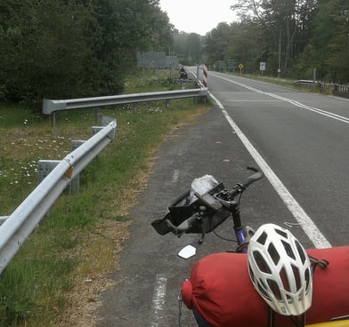 Nach elf Uhr brechen wir auf, kaufen noch ein paar Lebensmittel, und machen uns dann an die vermeintlich kleine Etappe. Den ersten kleinen Anstieg mit bis zu 8% Steigung buchen wir noch unter „Spaß“. Aber schon der nächste Berg bei km7 meint es ernst: gute 100HM, bis zu 17% Steigung, da will das Frühstück wieder raus! Wir machen oben Fotos, rauschen auf der anderen Seite noch steiler wieder runter und trösten uns damit, dass das die einzig große Steigung dieses Tages war.