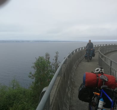 Es regnet in der Früh. Also, so richtig! Wir haben es aber gar nicht eilig, es stehen nur ca. 25 km auf dem Programm. Nach Frühstücken, Packen, einiges Besorgen ist es dann schon nach 11 Uhr und der Regen hat aufgehört. Es bleibt allerdings grau, und das passt perfekt zur Strecke: Sie ist schlicht scheußlich. Viele Autos, Gestank, und Müll, böse Steigungen, Industrie und Gewerbe, kaum etwas Schönes zu entdecken auf dem Weg zur Fähre. Nach ca. 10 km wird die Straße 4-spurig. Immerhin gibt es dann auch einen separaten Radweg, was mich doch einigermaßen rettet.