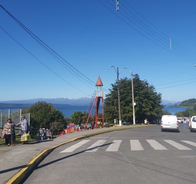 Am 2. Ruhetag wird mir die Ruhe dann zu viel: ich radle nach Pucon, 25 km relativ flach am See entlang. Eigentlich wäre das sowieso am Weg gelegen, aber die Grenze nach Argentinien können wir vorerst nicht kreuzen. Also eine Extratour. Der Daniel will lieber noch faulenzen. Die Straße ist höllisch befahren und hat leider fast keinen Seitenstreifen. Dafür flitze ich ohne Gepäck mit derartiger Geschwindigkeit, dass es einfach nur Riesenspaß macht. Pucon gefällt mir außerordentlich gut: es liegt direkt in den Bergen und hat endgültig eine alpenähnliche Atmosphäre, was durch die Stilart der Häuser noch verstärkt wird. Es ist sehr touristisch angelegt, aber da noch Vorsaison ist, gibt es keinen Rummel. Ich wandere stundenlang herum und esse leckeren Fisch.