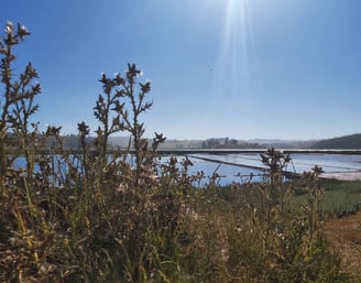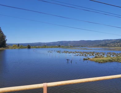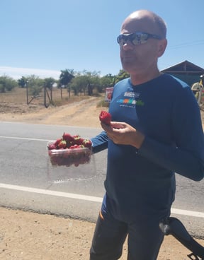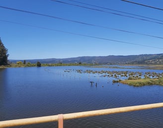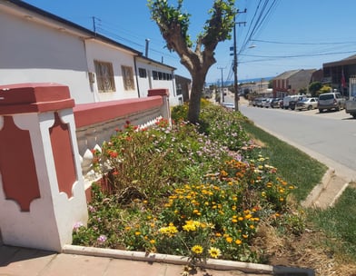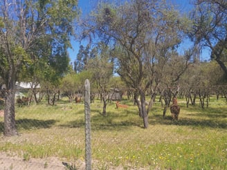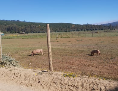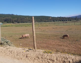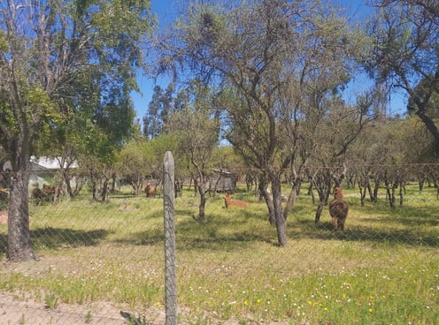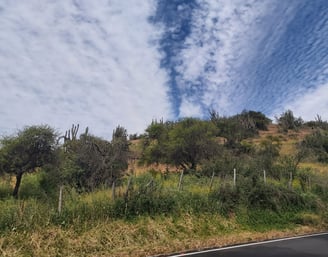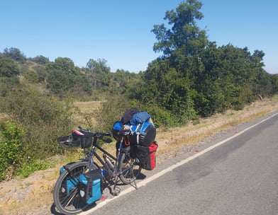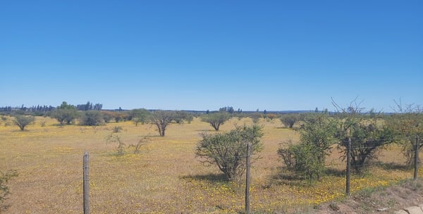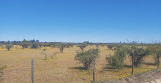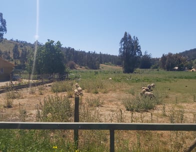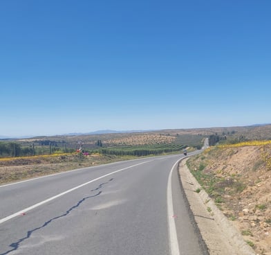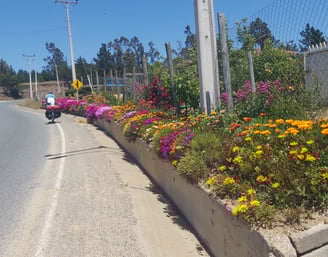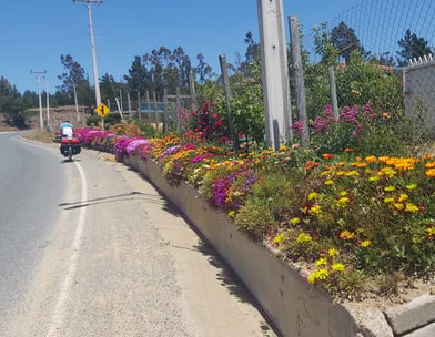 Mit einer Durchschnittsgeschwindigkeit von 11 km/h rollen schneckengleich gegen den Wind, der bei uns auch fast als Sturm durchgehen könnte. Trösten können wir uns damit, dass es wenigstens idyllisch, verkehrsarm und sonnig ist. Die Landschaft erinnert mich stark an die Toskana, Olivenhaine, Orangen- und Mandelbäume, sanfte Hügel. Immer wieder bemerkenswert ist das schiere Blütenmeer! Rund um uns duftet es und es fliegen hunderte Bienen in Blumen und Bäumen. Ansonsten gibt es erstaunlich wenig Insekten in Chile, zumindest haben wir bisher kaum welche gesehen.