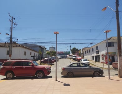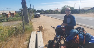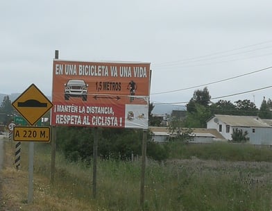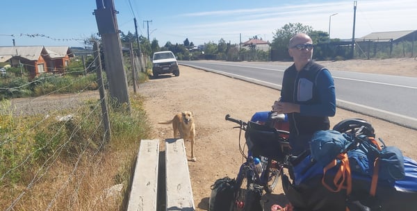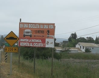 Ich spähe unterwegs aus dem Fenster; ich kann keine Räuber sehen und auch sonst keine Gefahren, die Route geht durch eher bürgerliche Viertel. Da hatten wir bei der Fahrt aus Santiago raus schon Schlimmeres! Die hilfreichen Beamten fahren uns 10 km weit zu einem kleinen Dorf, verabschieden uns, wünschen uns noch eine gute Reise und viel Glück.
