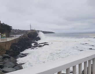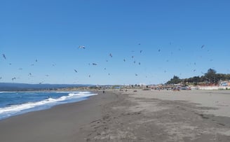 Pichilemu nennt sich selbst die Welthauptstadt des Surfens, und angesichts des Sturmes, der uns dort bei unserer Ankunft erwartet, glauben wir auch sofort, dass die Rahmenbedingungen dazu gegeben sind. Die Stadt liegt auf einem Hang direkt am Meer. Ganz unten, direkt am Strand, sind die Unterkünfte am billigsten, was ich mir mit der relativ allgegenwärtigen Tsunamigefahr erkläre. Überall stehen Schilder, in welche Richtung mensch im Falle des Falles rennen soll, und wo Gefahrenzone ist. Trotzdem ist es ein sehr entspannter Ort, der uns auf Anhieb gefällt. Nach den letzten 3 Fahrtagen sind wir doch sehr müde und beschließen, 2 Tage lang Beine und Seele am Strand baumeln zu lassen. Wir schlafen übrigens eher weiter oben am Hügel....