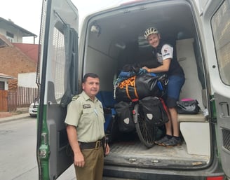 Einfach ist es nicht, in dem Wirrwarr an Straßen den richtigen Weg zu finden. Als wir nach nur einer halben Stunde Aufstieg ratlos am Straßenrand auf das GPS-Gerät starren, werden wir von einem entgegenkommenden Polizeibus erspäht. Der hat eine vollkommen zersplitterte Frontscheibe, der Fahrer kann fast nicht rauschauen. Sie wenden und halten neben uns. Der von uns gewählte Weg den Berg rauf sei viel zu gefährlich, alles voller wilder Räuber, warnen sie uns. Wir sollen doch lieber wieder runter und die Hauptstraße entlang aus Valparaiso raus. Die Hauptstraße ist viel zu gefährlich, voller wilder Autos und außerdem für Fahrräder verboten, argumentieren wir. Ja, das stimmt, müssen die netten Carabineros zugeben. Also gibt’s nur eine Lösung: Wir sollen die Räder in den Bus laden und sie bringen uns aus der Gefahrenzone raus! Gesagt, getan! Wir freuen uns über die nette Hilfe und den gesparten steilen Berg und genießen mal wieder eine neue Erfahrung. Mitfahrt im Polizeiauto als unbescholtener Bürger! Hatte ich noch nicht….