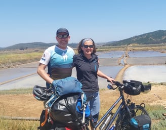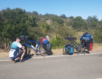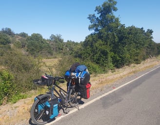 Um halb 10 Uhr sind wir dann ausgecheckt und endlich wieder auf der Straße. Es erwartet uns nicht ganz so viel Wind wie befürchtet, dafür erst mal satte Steigungen. Es geht durch Pinienwälder aufwärts und es riecht einfach herrlich! Weil Sonntag ist und die Straße sehr klein, herrscht kaum Verkehr. Hier ist so richtiges Hinterland, mit nur wenigen kleinen Häusern am Straßenrand.