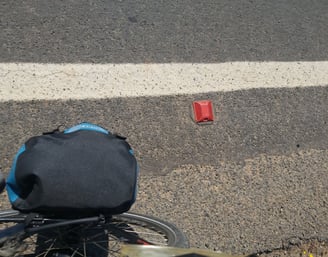 Langsam und fast unmerklich nimmt der Verkehr immer mehr zu, die Straße entwickelt sich zunehmend zu einem Radleralptraum, und kurz nach der letzten Stadt befinden wir uns an einer dieser Ausfallstraßen, die man in den Erinnerungen an Radurlaube gerne mal ausblendet. Ein Laster nach dem anderen donnert vorbei, nicht wenige liefern sich Elefantenrennen, wobei der Überholte dann in den Seitenstreifen ausweicht. Der Seitenstreifen ist zwar theoretisch meistens breit genug, aber wenn gerade nicht alles voller Dornen, Dreck und Müll liegt, dann sind bestimmt diese blöden Reflektorhügel in den Teer gebaut, die für Autos wenig Probleme bereiten, Fahrräder aber gerne mal aus der Spur bringen. Die kleine Version Reflektorhügel gibt es hier standardmäßig alle 25 m, gerade auf dieser Strecke sind aber besonders große Prachtexemplare davon verbaut und die dann im 5m-Abstand….
