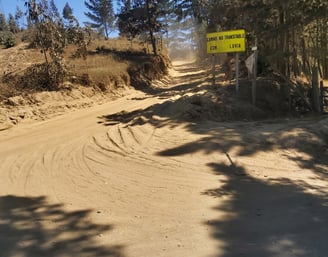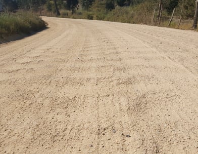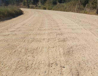Und gleich darauf ist Schluss mit Teer; stattdessen gibt es Schotter mit Waschbrettmuster.
