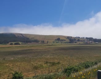 Immer wieder erhaschen wir von der hoch gelegenen Straße einen Blick auf das Meer. Allerdings schlägt da unten der Nebel schon wieder zu; während wir oben meist im strahlenden Sonnenschein radeln, ist unten dicke Suppe. Gelegentlich streckt der Nebel seine Finger den Berg rauf, und dann wird es kurz mal auch bei uns deutlich kühler.