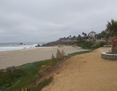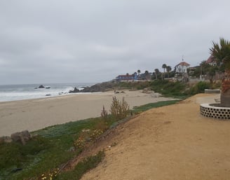 Nach ca. 40 km Gehügle geht’s dann wieder in die zona urbanica, mit Häusern, Straßen, Autos, dafür aber auch mit Meer. Schlagartig ist es auch vorbei mit der Wärme und Sonne, es ist neblig und sehr kühl an der Küste. Schön ist es trotzdem, neben allerlei hässlichen Hotelburgen für urlaubswütige Santiager gibt es herrliche Strände, schöne Felsen, auch immer wieder nette kleine Häuschen.