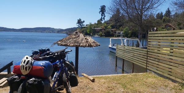 Die nächsten 13km sind wunderschön, der Asphalt ein Genuss, aber die Sonne und ein kleiner Anstieg nach dem nächsten zehren weiter an den Kräften. Deshalb sind wir gern bereit, uns bei einem Lunchstopp am Minimarket mit salzigen Nüssen, Bananen, Saft und Bier auf ein langes Gespräch mit einer Chilenin einzulassen, bei dem wir nicht immer alles verstehen. Dann kommen die letzten km bis zum Abzweig. Wir stoppen am See, stellen uns hinein – und plötzlich diskutiert Conni, ob wir uns nicht hier eine Cabana nehmen und das Abenteuer auf morgen verschieben sollen. Aber ich will es jetzt hinter mich bringen!